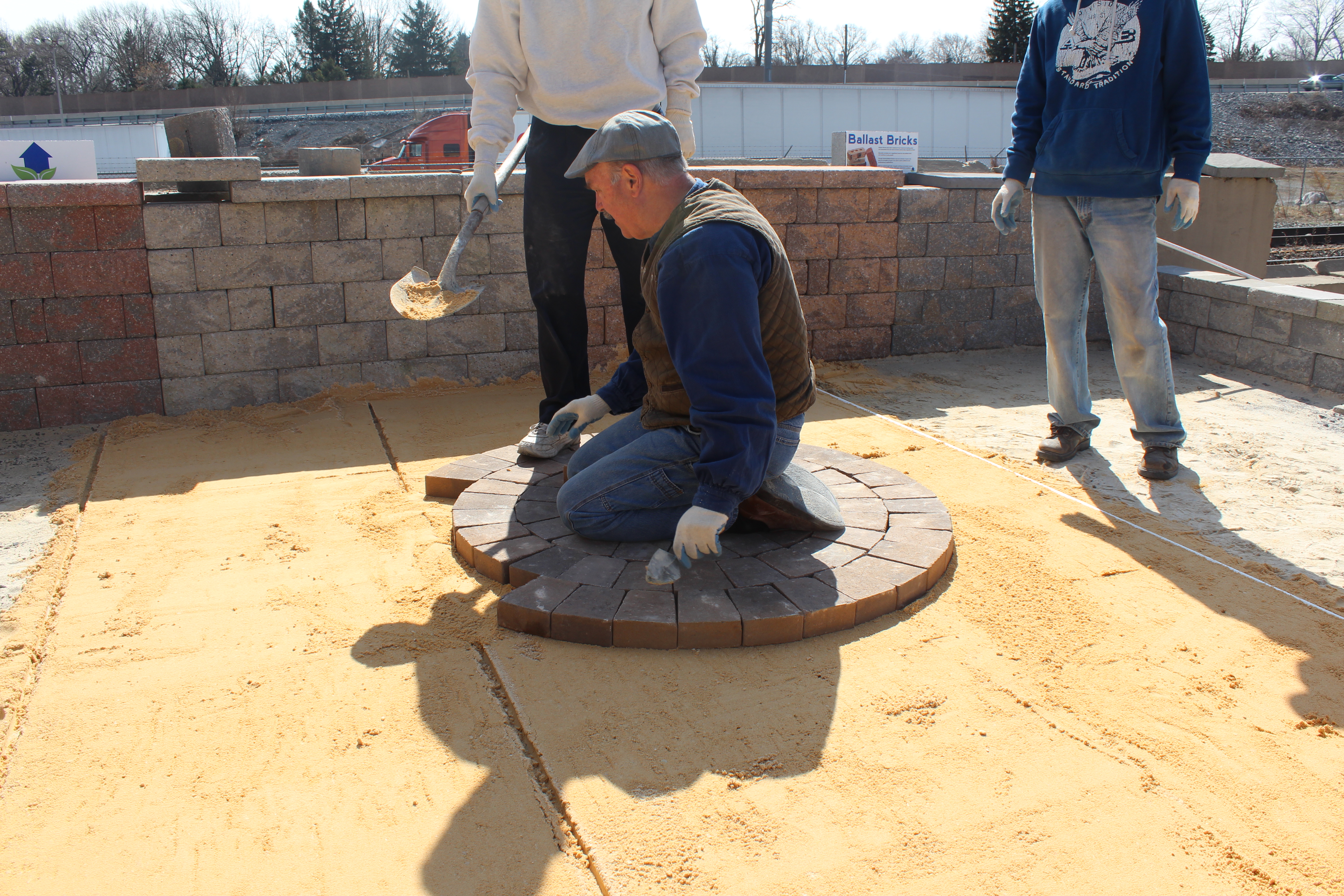 Building a circle kit is an easy solution to create a unique hardscape feature to your patio. Simply layout the pavers in the formation provided in the instructions. Shown here a builder s putting together a 10 foot radius circle kit.